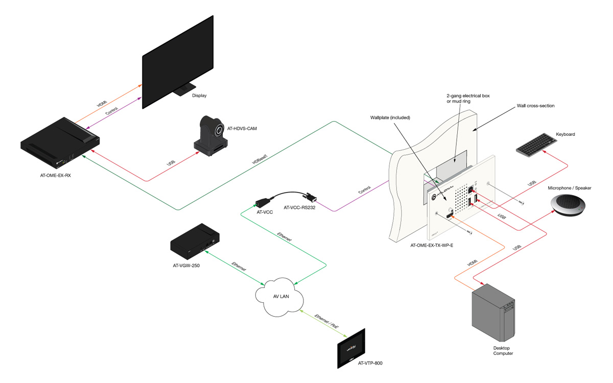 - Video conferencing – The OME-EX-TX-WP-E and a compatible Omega Series receiver or switcher are ideal for soft codec and web-based conferencing applications, with the ability to integrate with PCs, cameras, speakerphones, and microphones.