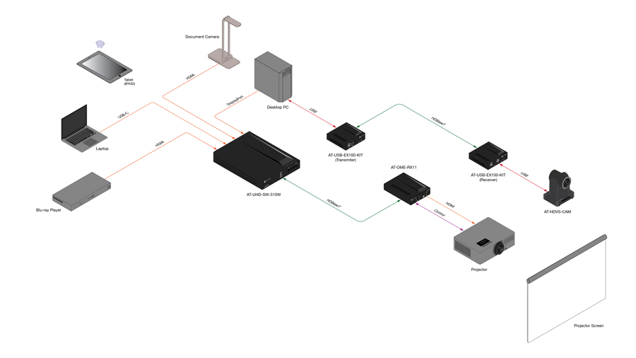 - Lecture Capture – The USB-EX100-KIT extends USB signals from a camera installed at the back of a classroom or lecture hall to the capture equipment located in the podium or rack.