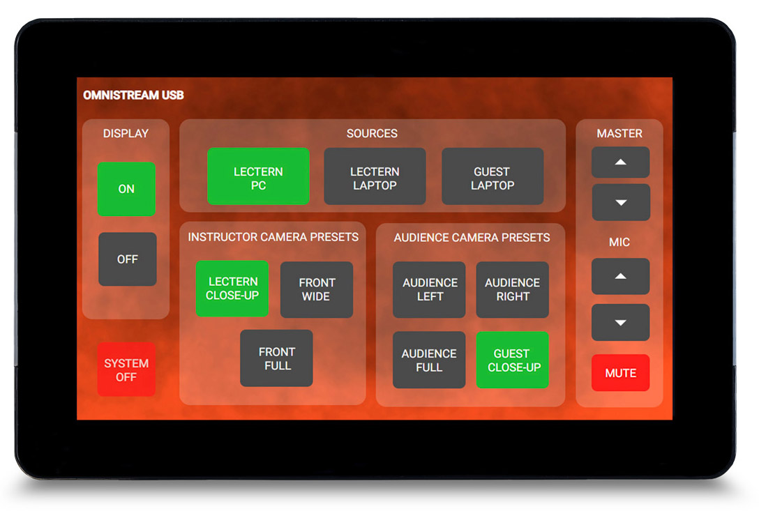 While not shown in the graphic above, a touch panel or keypad control system will be required to manage this USB over IP system. From the touch panel interface, users select which computer will be used for presentation, i.e. the instructor’s room PC, BYOD laptop, or the student/guest laptop. Once a selection is made, the control system links the appropriate USB IP host interface to all the USB IP device interfaces. At this point, the chosen computer will have access to both cameras, the interactive display, and the audio system for a presentation or video conference session. At any point, the control system can dynamically change the USB routing to one of the other computers.