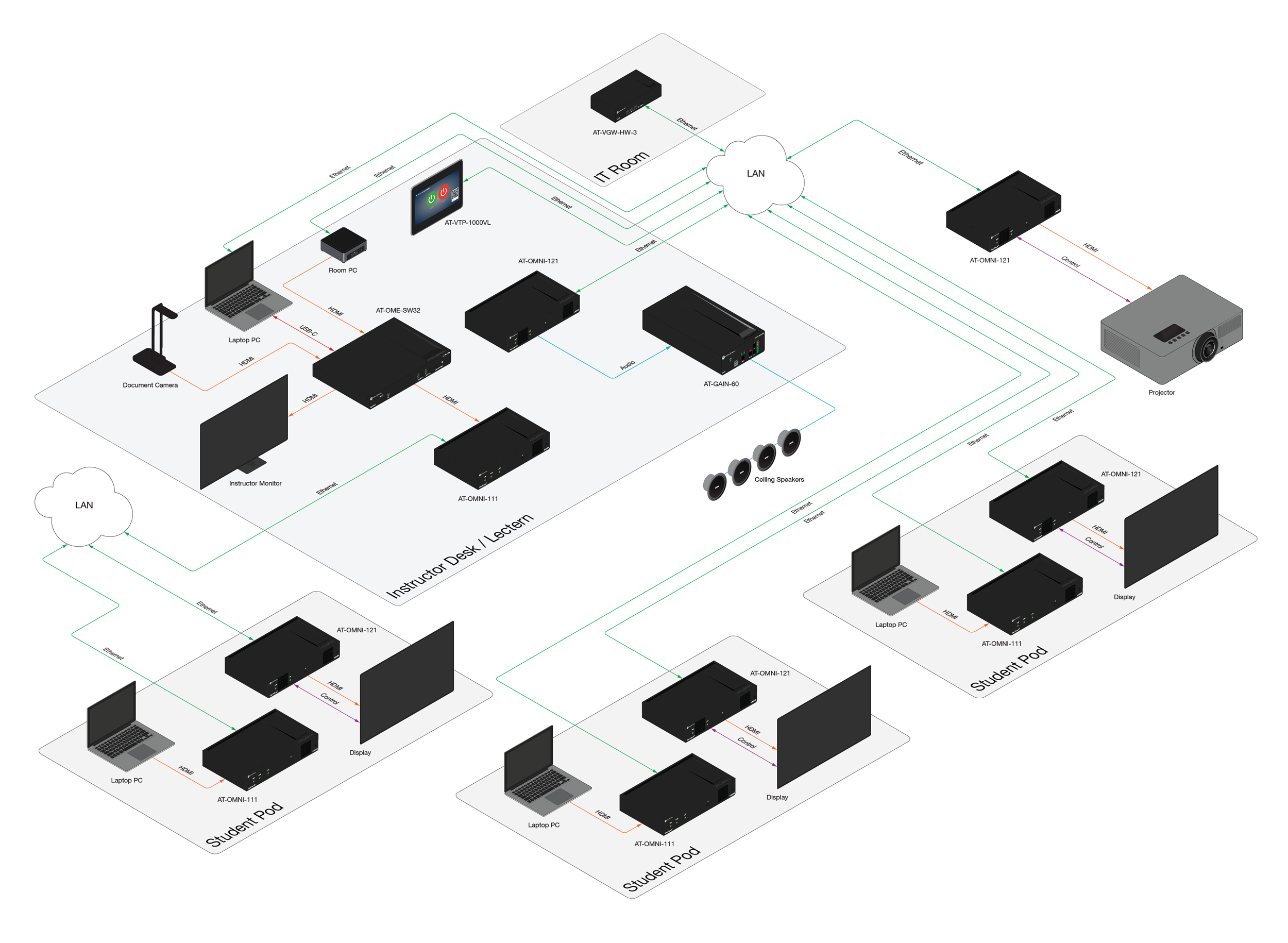 Each student pod includes an AT-OMNI-111 encoder that interfaces with a student’s laptop and an AT-OMNI-121 decoder connected to the local flat-panel display. AV over IP allows student content to be shared at their pod, or the instructor can share student content to all displays.