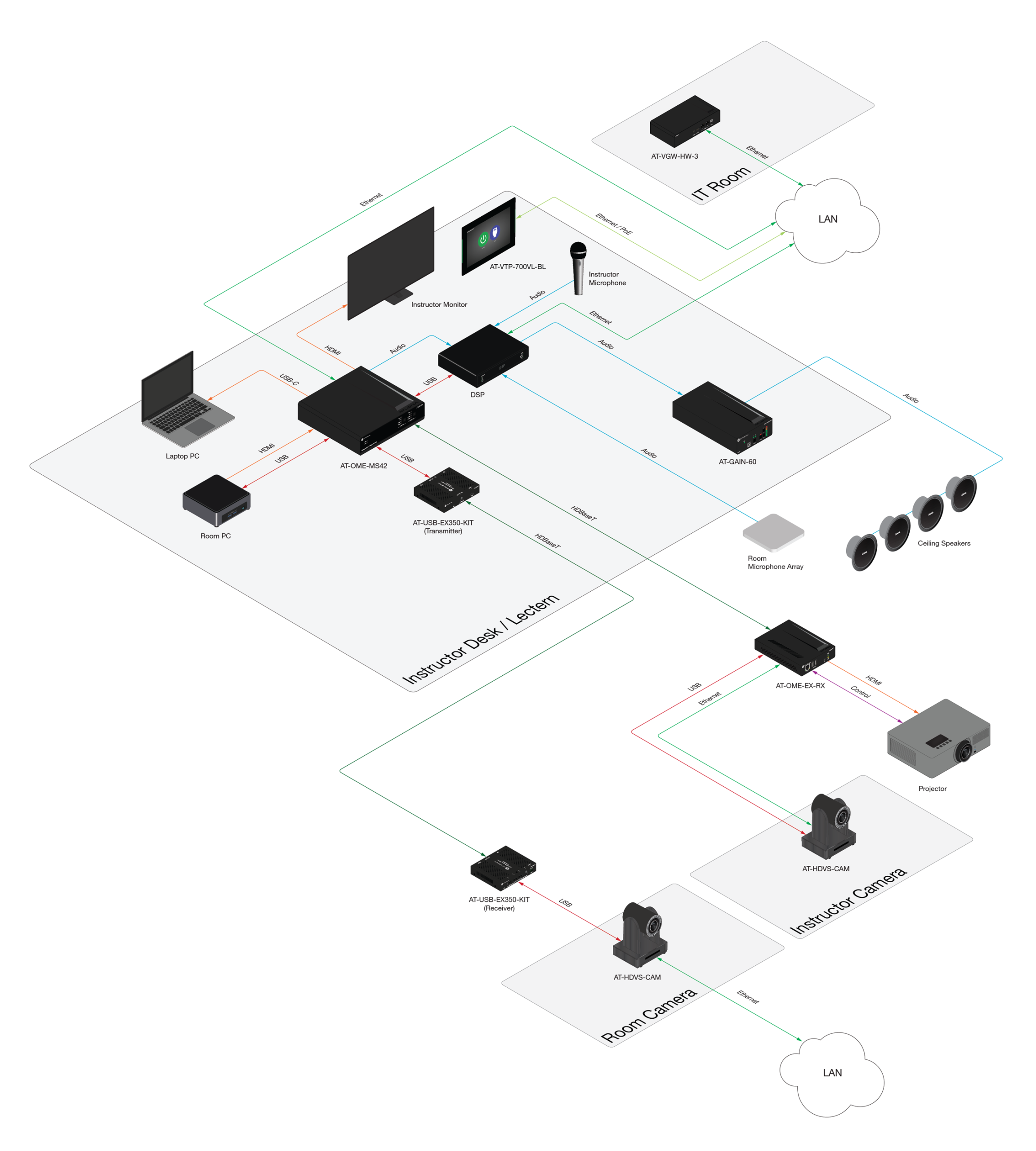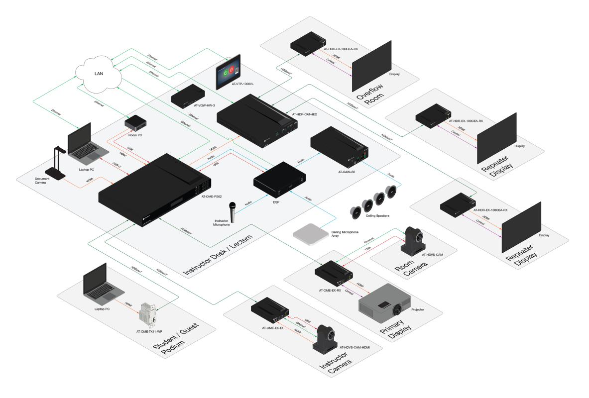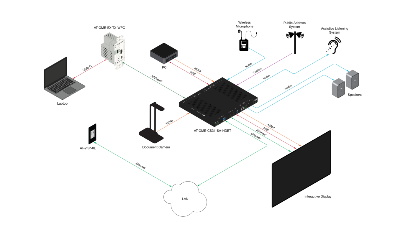 Many Omega Series products are ideal for open spaces, with slim-profile enclosures for concealed installation in furniture and behind wall-mounted displays. The AT-OME-SW21-TX is an HDMI and USB-C switcher that feeds into the AT-OME-EX-RX behind the display.