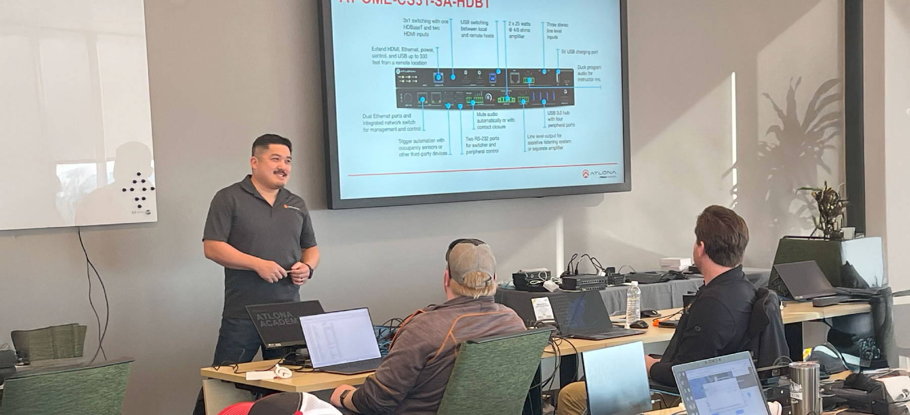 We do not charge for training; however, you do have to pay to get to the training city and pay for a hotel. Atlona pays for lunches and one dinner, and most hotels have a discount code and include breakfast.
