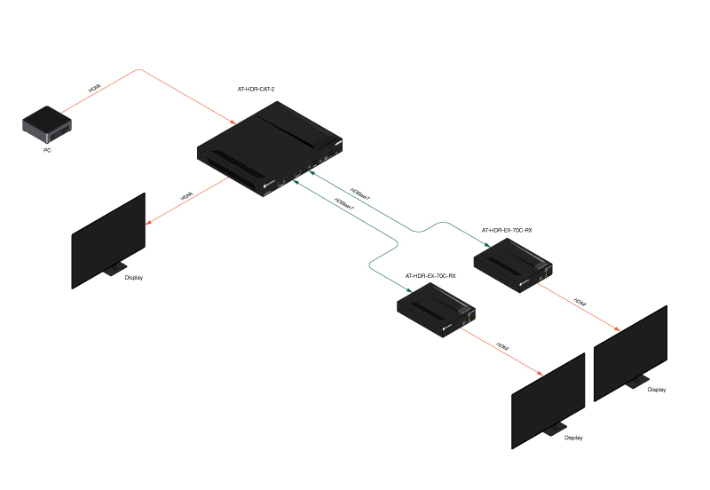 Send a single HDMI source to two displays at distances up to 130′ (40 m) for video distribution applications including hospitality and retail, commercial reception areas or warehouses, and educational AV systems that require multiple screens.
